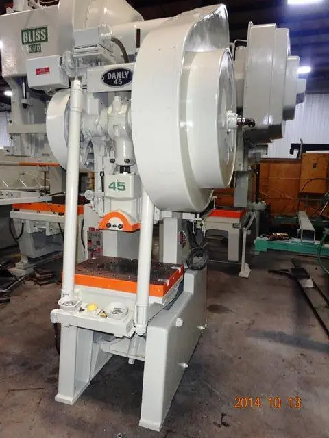 For sale: Used DANLY 45 Ton OBI Press, Stock #13014J. Features include a 49-ton capacity, 3" stroke, air clutch and brake, and a VS motor. Dimensions: 7' L x 6' W x 102" T. Located in Columbia, TN. Call for pricing.