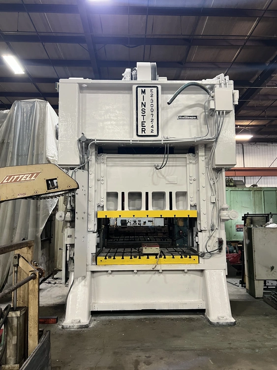 For sale: Used MINSTER E2-300 SSDC Press, 300-ton capacity, S/N 18290. Equipped with scrap conveyor, air clutch/brake, work platform, and more. Stroke: 8", bed: 72"x42". Approx. weight 100,000 lbs. Ideal for demanding applications.