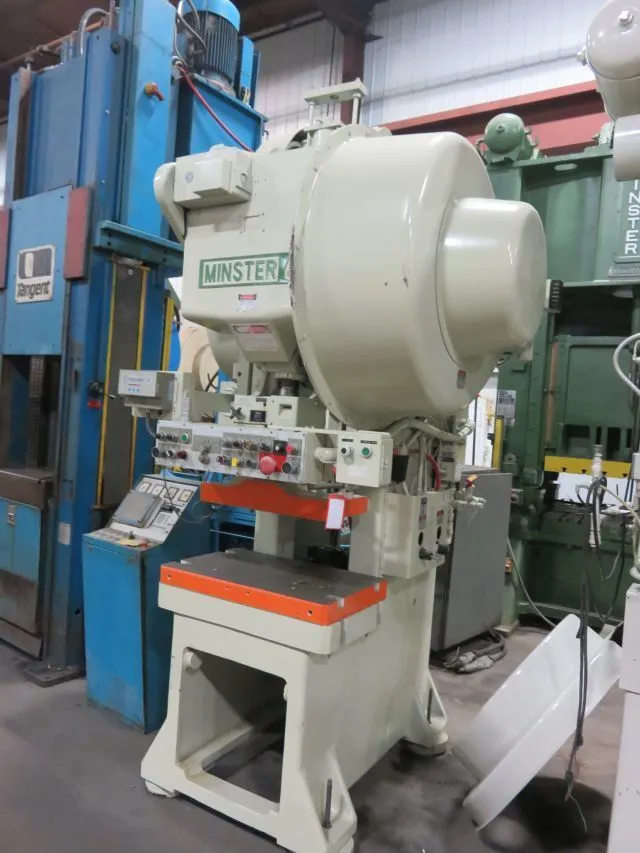 MINSTER 60 Ton OBI Press, Model 6SS, S/N 6SS-27590. Features include 3.5" stroke, 2.75" powered ram adjustment, 13.25" shut height, with 50-100 SPM range. Equipped with air clutch, brake, and counterbalances. Good used condition, Stock# 13295J.