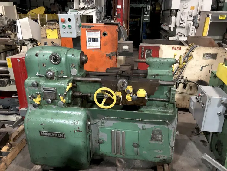 MONARCH EE Toolroom Lathe for sale, model #14092T. Features include 12.5" swing over bed, 20" distance between centers, variable speeds up to 4000 RPM, taper attachment, and tailstock. Note: leadscrew and handle of compound rest are missing.