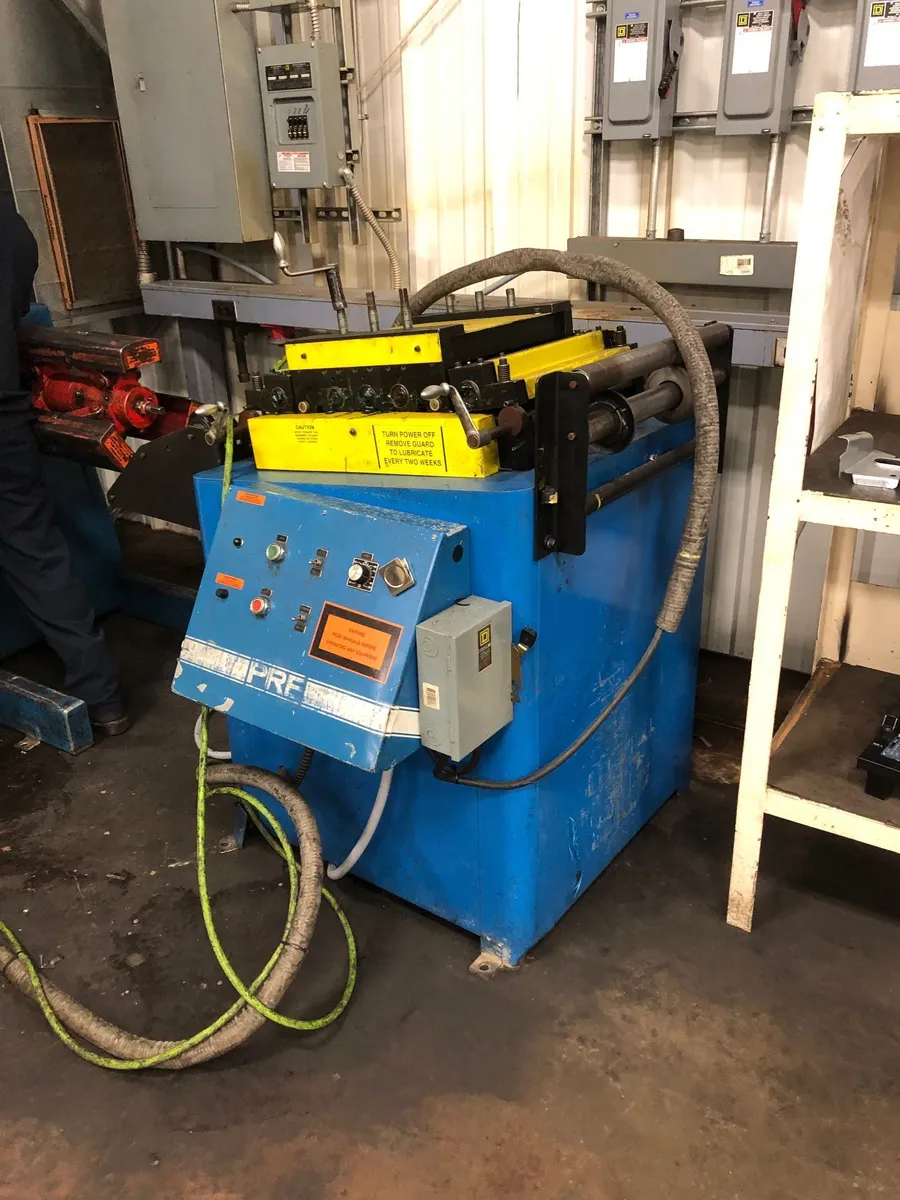 2002 PRE 4,000 lb x 12" x .092" Servo Feed Line, stock# 13875J. Right to left feed, includes straightener with 7 rolls, air brake, and a 4,000 lb uncoiler. Serial no. 0402-014. Manual expansion, 100 FPM speed. Good used condition.