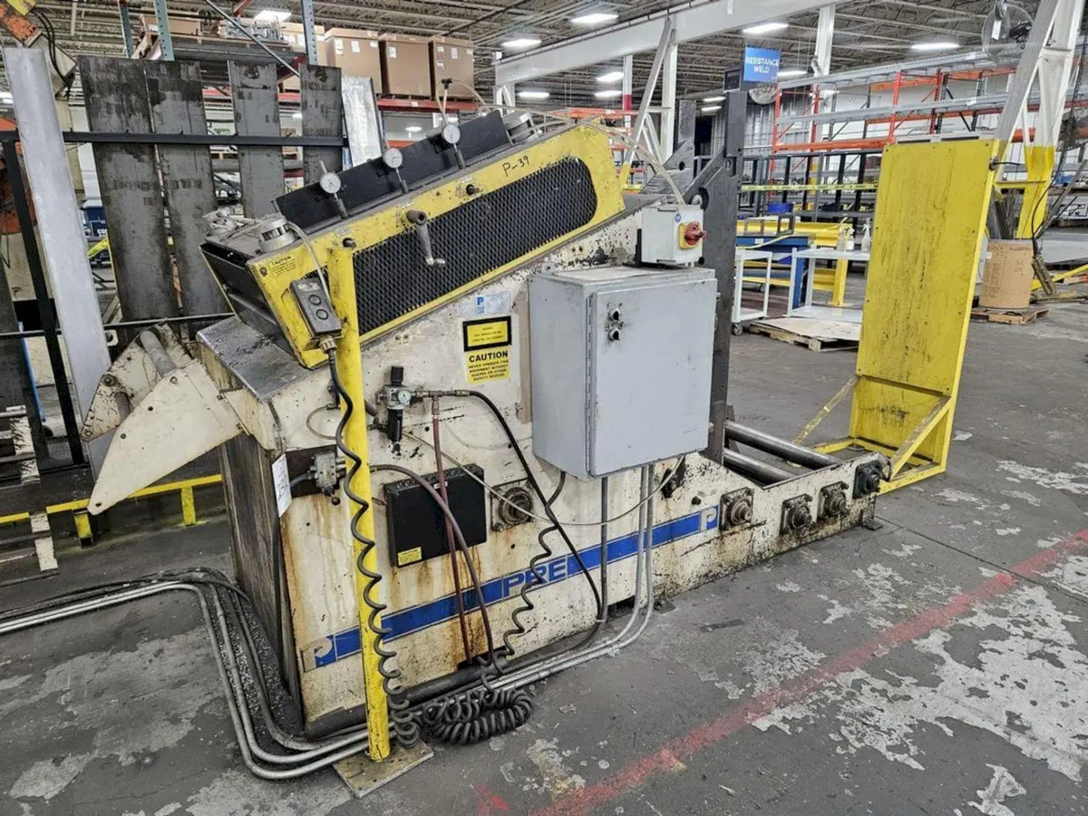 PRE coil cradle straightener, Model: 10,000 LB X 24" X .250". Used condition. Handles 10,000 lb max coil weight, width 24", thickness .020"-.250". Features 7 roll straightener, entry/exit pinch rolls, pendant for jogging, manual guide adjustments. Stock# 14297J.