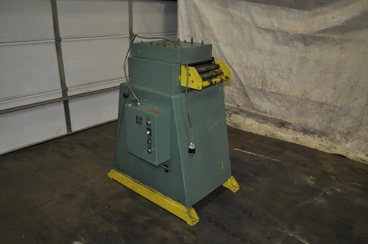 PA INDUSTRIES 12" X .189" Straightener, Stock# 14315J. Handle coil widths up to 12" with .020" - .189" capacity. Features 7 roll straightening, adjustable guides, and loop control. Compact and precise, ideal for industrial applications.