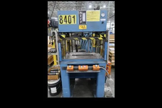 Used NEFF 4.5 Ton 4 Post Hydraulic Press, Stock# 14332J. Features 6" stroke, 16" daylight, 34" x 24" bed and ram, 3000 PSI max, light curtains, palm buttons, and operates at 5 HP 230/360/60/3. Ideal for various industrial applications.